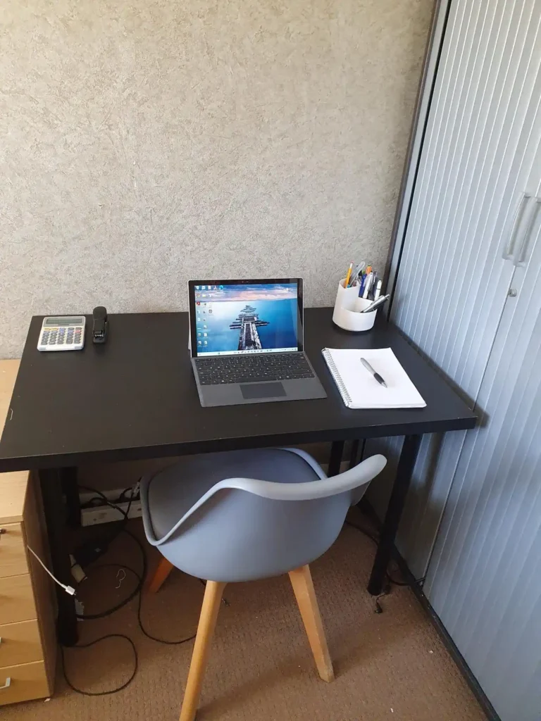 - She worked from a laptop placed directly on an old table without an external monitor.