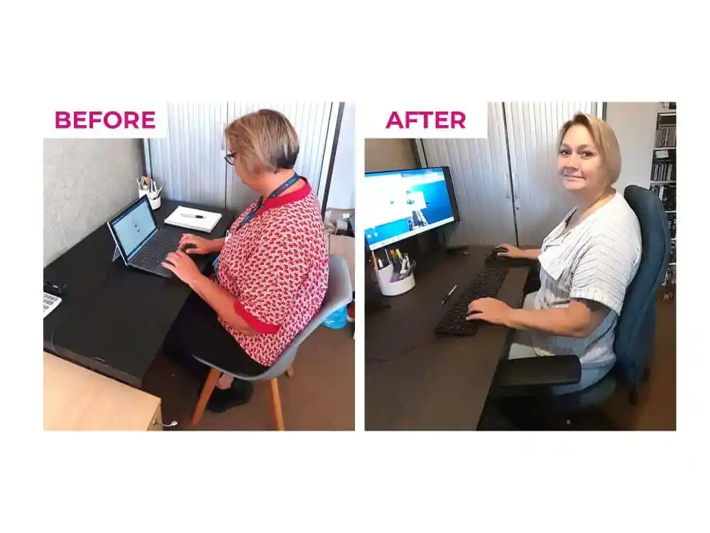 Karen’s employer provided a budget to purchase the recommended ergonomic equipment, including an adjustable chair, laptop stand, external monitor, keyboard, and mouse. She also rearranged her home office to optimise the lighting and working conditions.