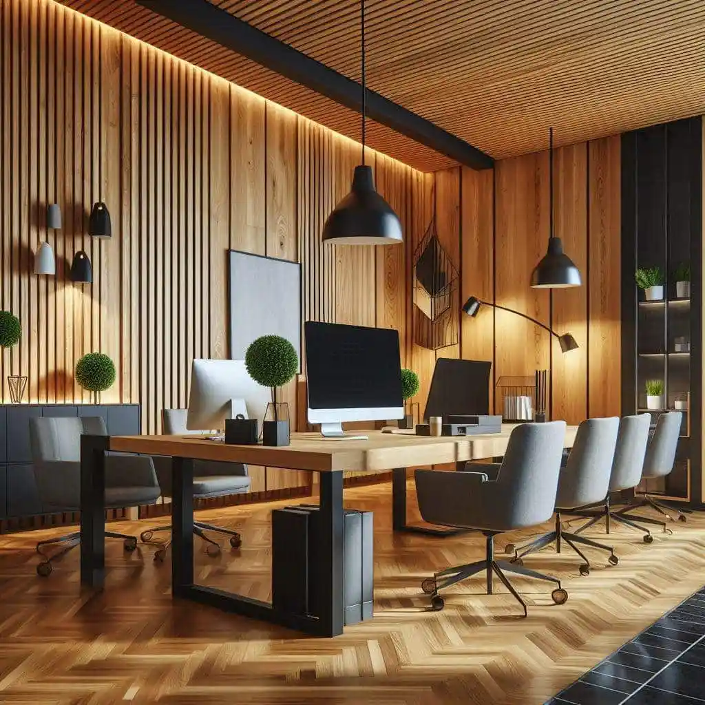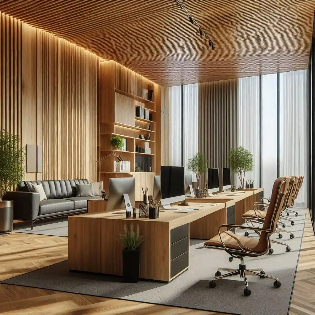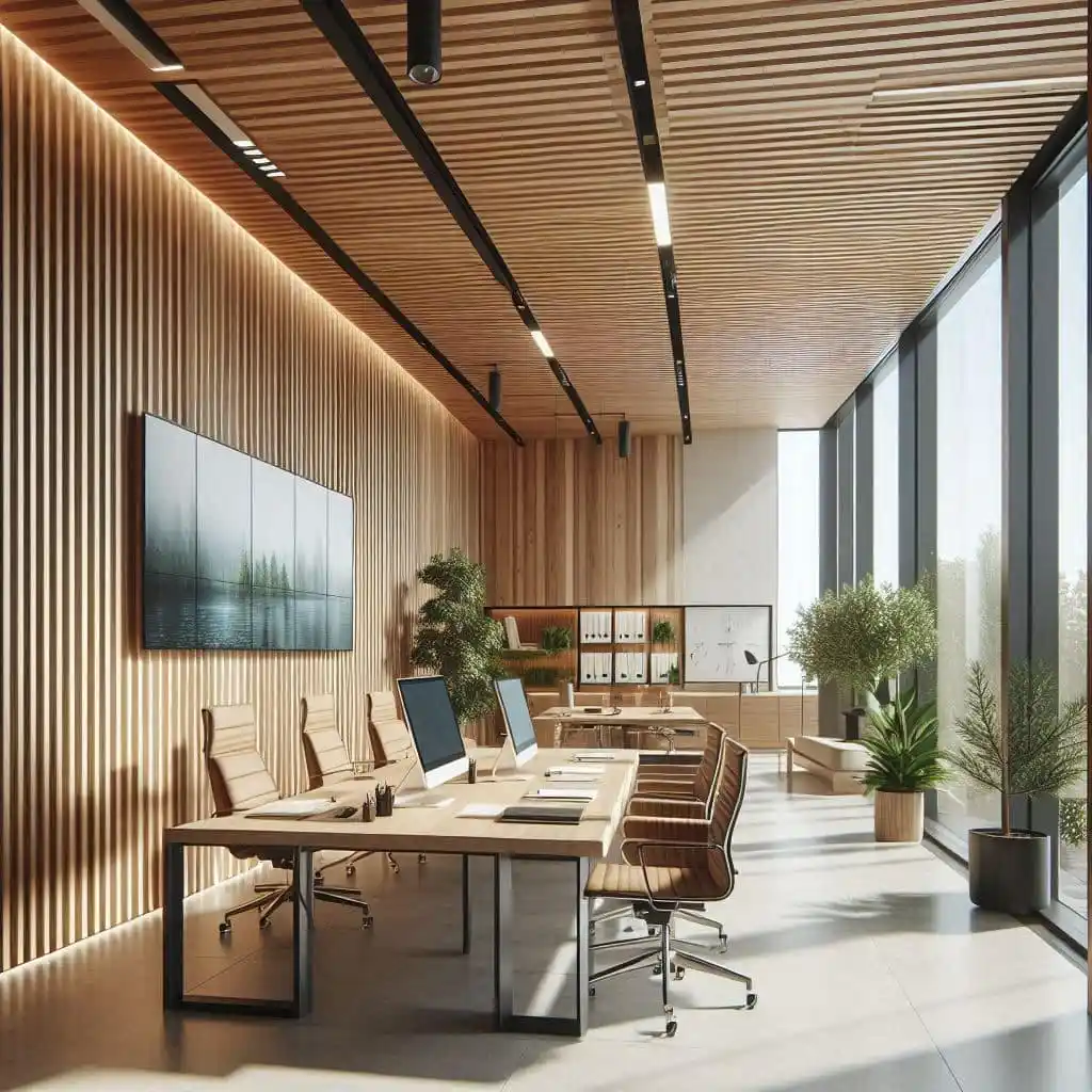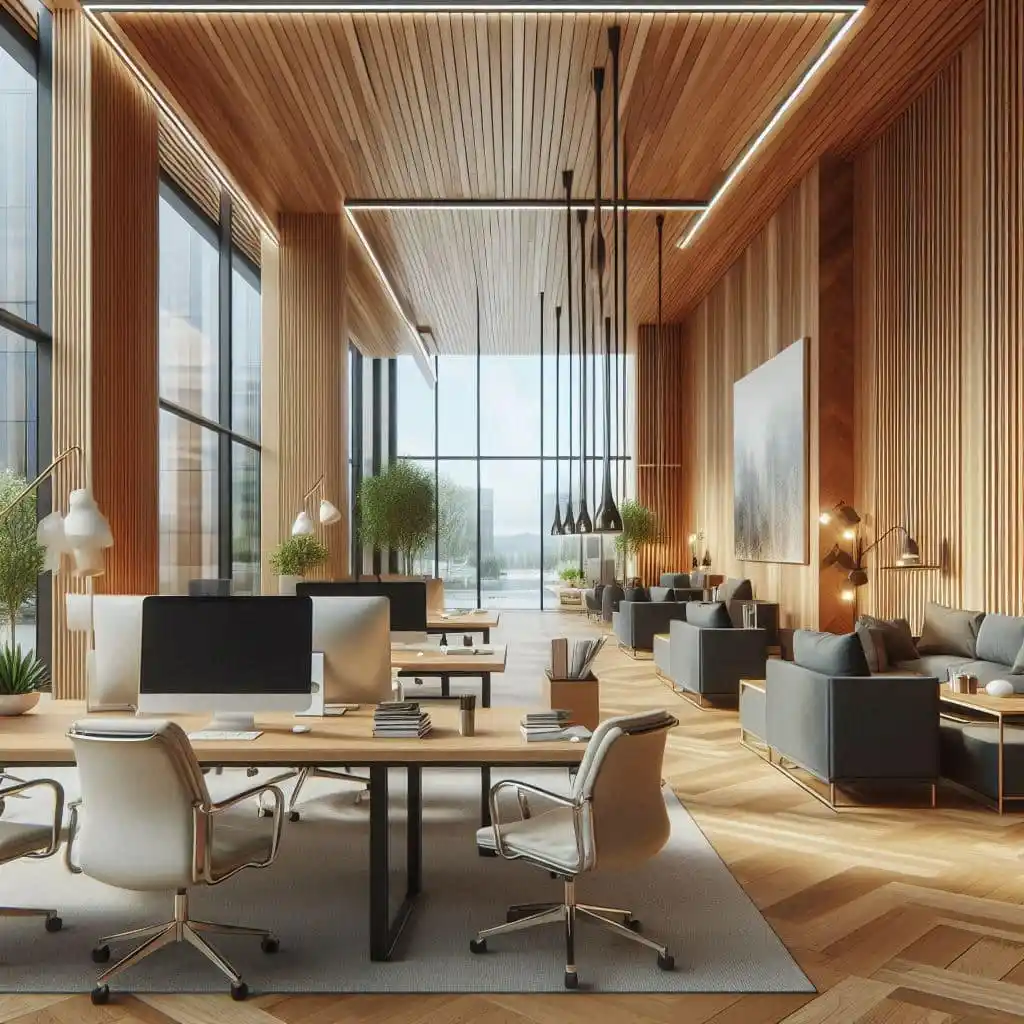- Cedar Panelling: Sustainable cedar wood was chosen for wall panelling to add warmth and texture to the office, providing a sophisticated yet natural feel.