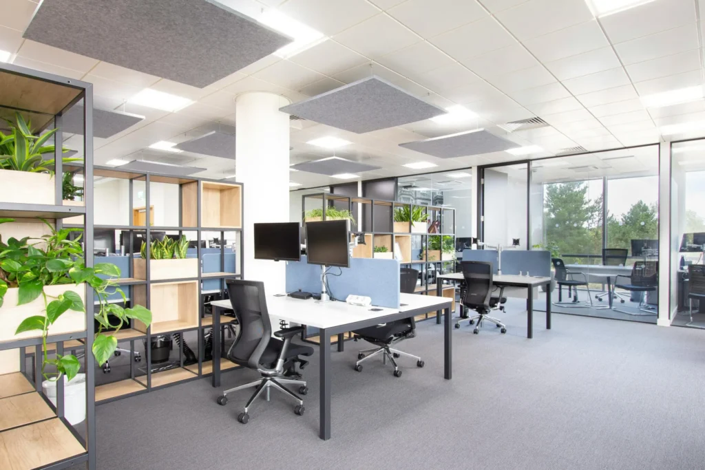 - Biophilic Design: Integration of plants throughout the office to enhance air quality, reduce stress, and improve overall well-being.