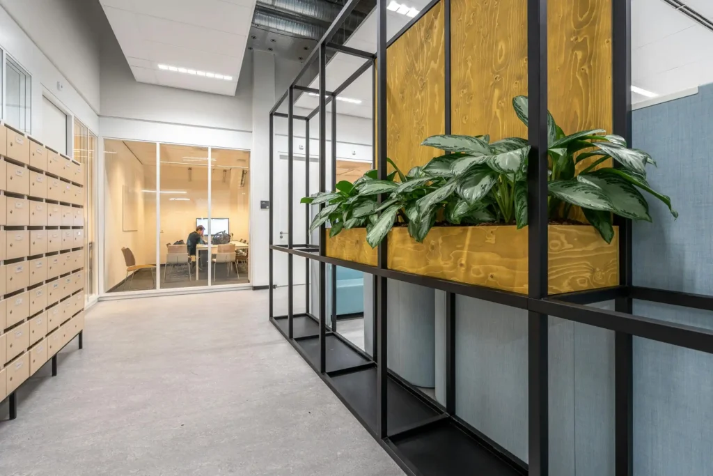 - Green Walls: Living green walls in communal areas created focal points and added to the office’s biophilic design.