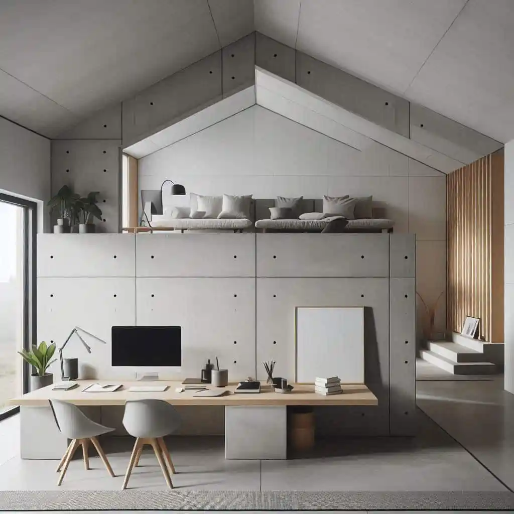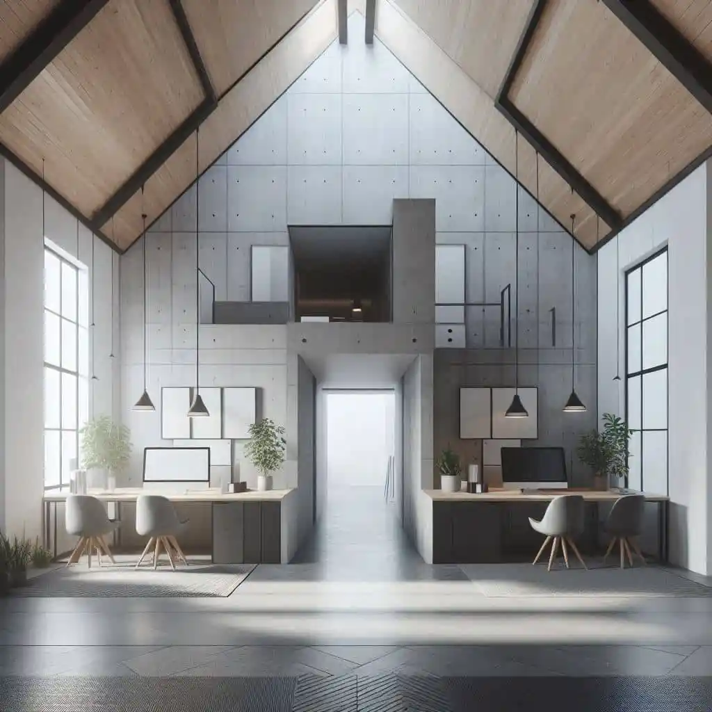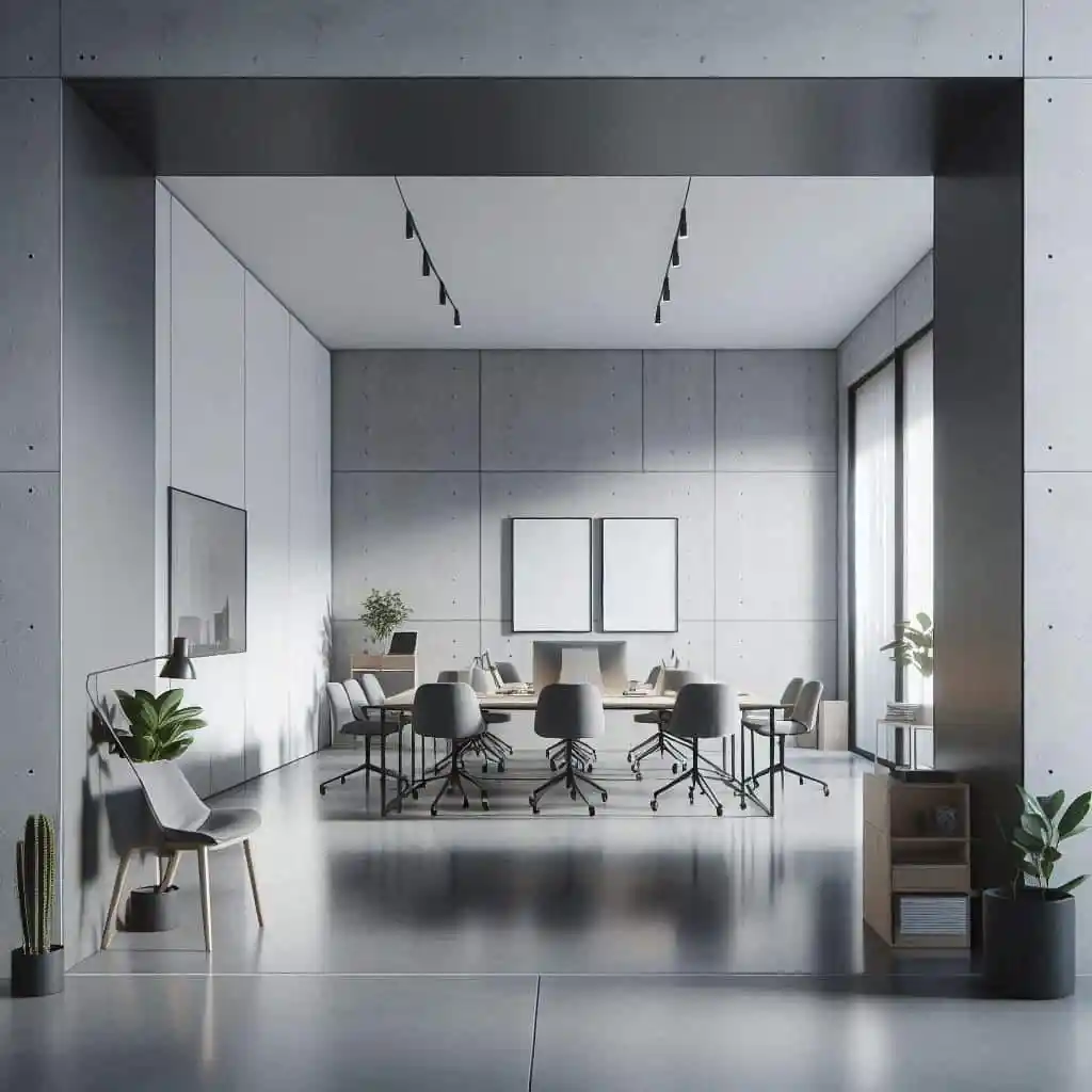 - Concrete Floors: Polished concrete floors were used throughout the office, providing a durable and stylish foundation that complemented the minimalist aesthetic.