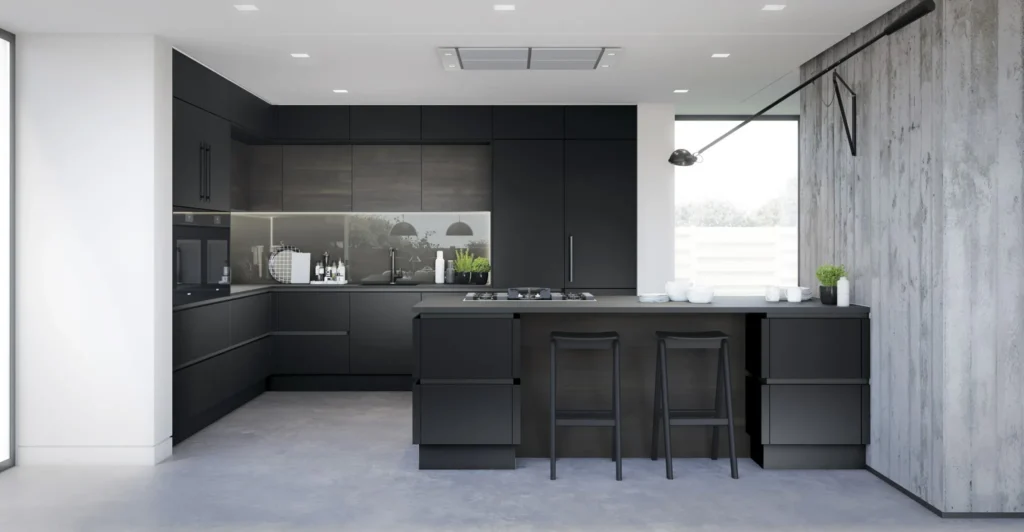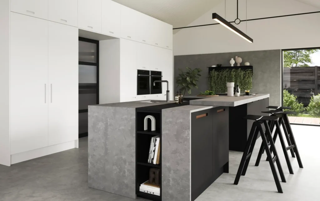 - Kitchen: An open kitchen with concrete countertops and minimalist white cabinetry was installed, offering a sleek and functional area for staff to prepare meals.